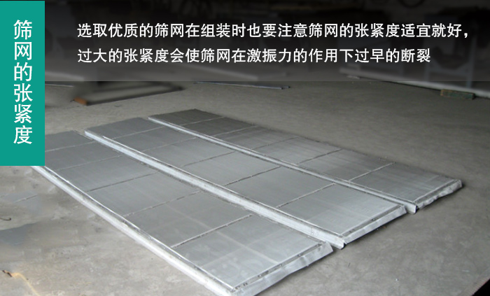 選取優(yōu)質(zhì)的篩網(wǎng)在組裝時(shí)也要注意篩網(wǎng)的張緊度適宜就好,過大的張緊度會(huì)使篩網(wǎng)在激振力的作用下過早的斷裂。
