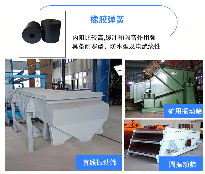 橡膠彈簧一般用于直線振動(dòng)篩,不銹鋼振動(dòng)篩,圓振動(dòng)篩,礦用振動(dòng)篩中。