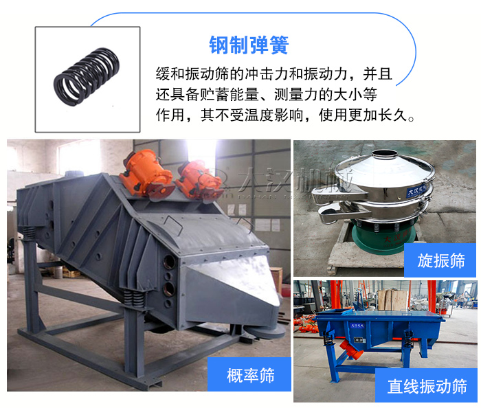 鋼制彈簧可以控制篩機(jī)的運(yùn)動(dòng),緩和振動(dòng)篩的沖擊力和振動(dòng)力,并且還具備貯蓄能量、測(cè)量力的大小等作用,其不受溫度影響,使用更加長(zhǎng)久。