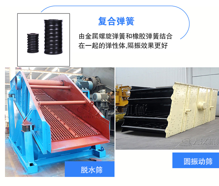 復(fù)合彈簧是由金屬螺旋彈簧和橡膠彈簧結(jié)合在一起的彈性體,集金屬?gòu)椈珊拖鹉z彈簧的優(yōu)點(diǎn)于一體,并克服兩者的缺點(diǎn),隔振效果更好,適用于礦山、冶金、煤炭等行業(yè)的大型振動(dòng)設(shè)備,如圓振動(dòng)篩,脫水篩設(shè)備中。