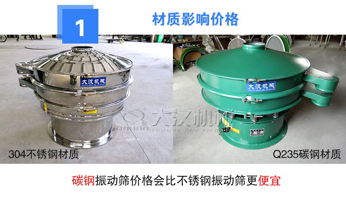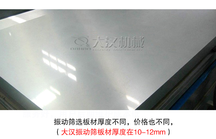 振動(dòng)篩材質(zhì)一般分為Q235碳鋼材質(zhì)與304不銹鋼材質(zhì)(也有使用316L不銹鋼),選用不同材質(zhì)的振動(dòng)篩,其價(jià)格是不同的,碳鋼振動(dòng)篩價(jià)格會(huì)比不銹鋼振動(dòng)篩更便宜,而且振動(dòng)篩選板材厚度不同,價(jià)格也不同,板材足夠厚,篩機(jī)使用更長(zhǎng)久(大漢振動(dòng)篩板材厚度在10-12mm)。
