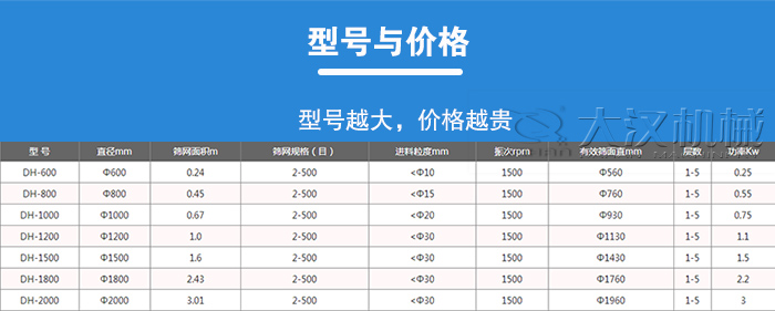 顆粒分級振動篩型號多樣化,包含DH400、DH600、DH800、DH1000、DH1200、DH1500、DH1800、DH2000等20多種,這些設(shè)備型號不同,篩網(wǎng)面積、電機功率、處理量等各有差異,制造費用方面也會有所不同,通常來講,型號越大的設(shè)備處理量更大,價格也會更高,為客戶帶來的經(jīng)濟利潤更是不可估量。