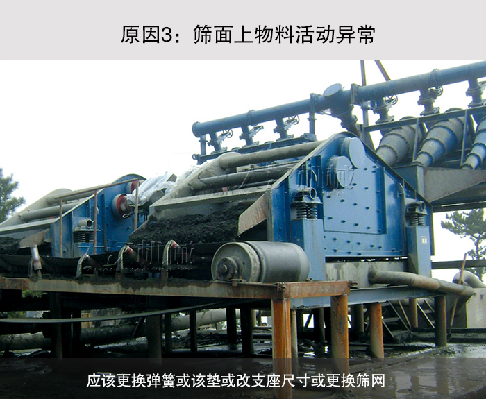 出現(xiàn)這種情況,一般是因?yàn)椋孩倏赡苁呛Y箱剛度不足存在臨界頻率,,聯(lián)接螺栓已振松,甚至到全面振松的程度需要立刻緊固。②篩箱的橫向水平?jīng)]找準(zhǔn),應(yīng)該更換彈簧或該墊或改支座尺寸,還有可能篩面網(wǎng)破損引起,只要更換篩網(wǎng)即可。