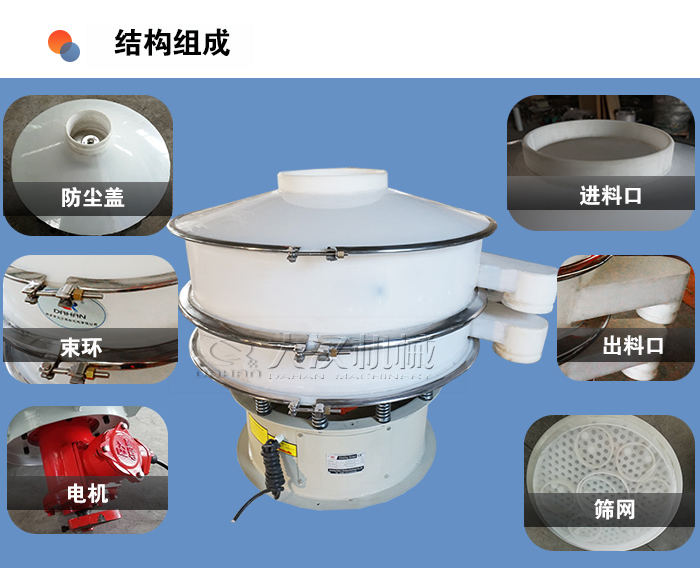 由進(jìn)料口,防塵蓋,出料口,篩網(wǎng),束環(huán),配重塊,上部重錘,振動(dòng)體,電機(jī),彈簧,機(jī)座,下部重錘所組成?! ?/p>