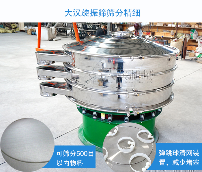 80目—200目的珍珠巖粒度較小,使用直線振動(dòng)篩無法滿足精度上的要求,這時(shí)候應(yīng)該采用旋振篩設(shè)備,大漢旋振篩篩分精細(xì),可以篩分500目以內(nèi)的粉狀及顆粒狀物料,另外加裝彈跳球清網(wǎng)裝置,可減少篩孔堵塞的問題,提高篩分精度。不過,根據(jù)珍珠巖的容重不一樣,同樣型號(hào)的旋振篩能達(dá)到的產(chǎn)量也不一樣,一般處理量在0.2t/h--5t/h。