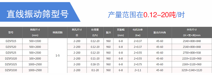 直線振動篩DZSF515、DZSF520、DZSF525、DZSF1020、DZSF1025、DZSF1030,產(chǎn)量范圍在0.12-20噸/時,直線振動篩的型號主要是根據(jù)用戶的篩分產(chǎn)量來決定的,產(chǎn)量越高的直線振動篩,其價格就會越高。