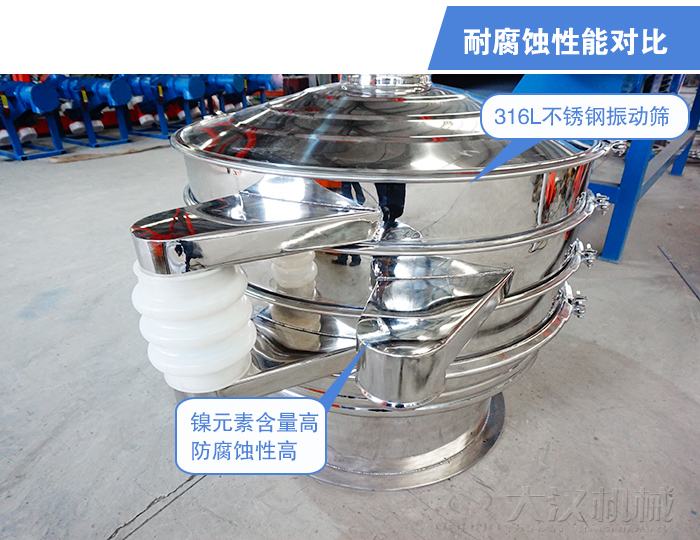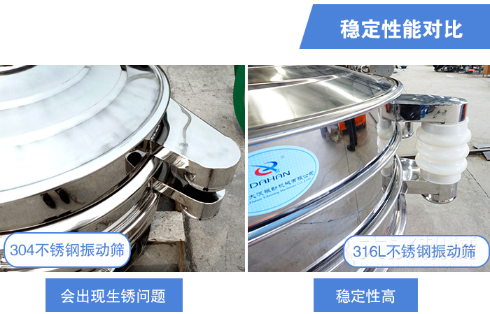 316L不銹鋼振動篩降低材質(zhì)中鉻的含量,增加了鎳元素的含量從而防腐蝕性高于304不銹鋼材質(zhì)的振動篩。
