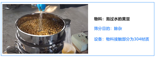 客戶三:要一臺(tái)旋振篩與物料接觸部分要304材質(zhì),用于篩泡過水的黃豆,除雜用,把黃豆里面的小石子和細(xì)沙過濾掉