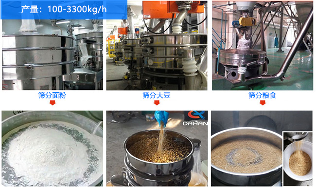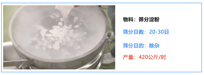 客戶四:篩分淀粉,除雜,過20-30目篩網(wǎng),產(chǎn)量420公斤/時(shí),一天連續(xù)24小時(shí)生產(chǎn)