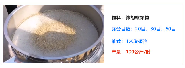 客戶六:自用 篩胡椒顆粒 選的1米旋振篩 機(jī)裝20目,30目,60目 物料流動(dòng)性好 一個(gè)小時(shí)100公斤 20目以上的占5成,60目以下的占3成