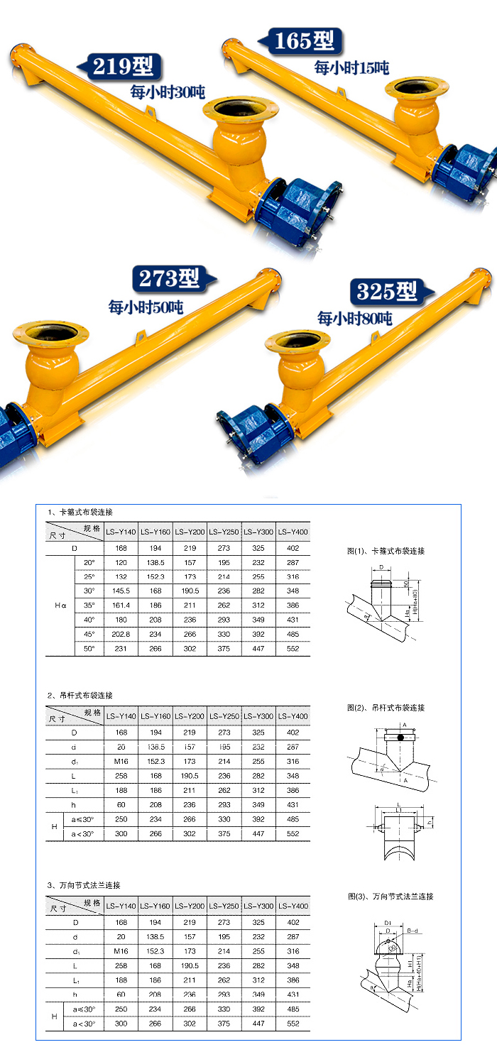 5、螺旋輸送機進料口與水泥倉口連接方式分為:球鉸法蘭剛性連接和吊掛加防水帆布軟連接二種形式。可視設(shè)備拆裝頻繁程度決定接口形式。