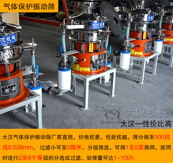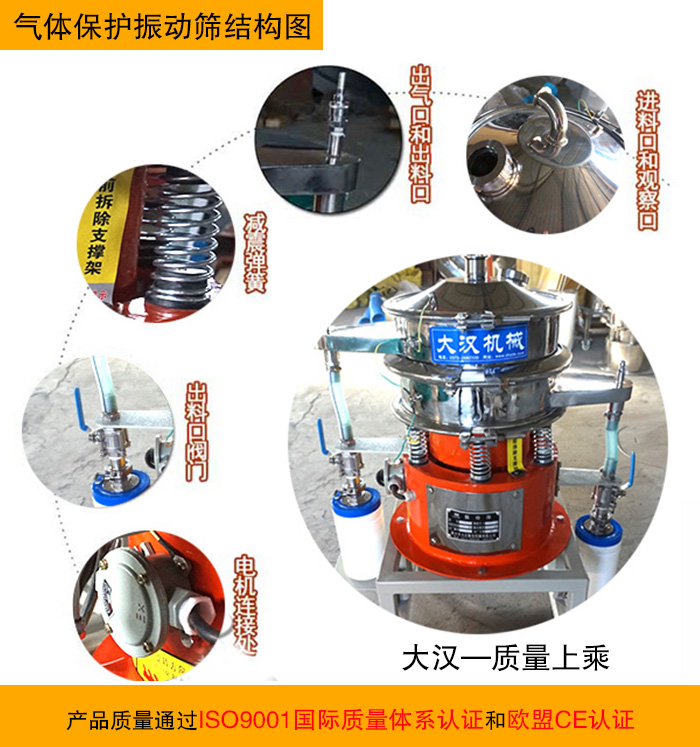 大漢氣體保護(hù)振動(dòng)篩采用304不銹鋼材質(zhì)、氣體保護(hù)軟管、防靜電裝置等制作而成,是振動(dòng)篩和超聲波振動(dòng)篩的一種衍生產(chǎn)品。產(chǎn)品質(zhì)量通過ISO9001國際質(zhì)量體系認(rèn)證和歐盟CE認(rèn)證。
