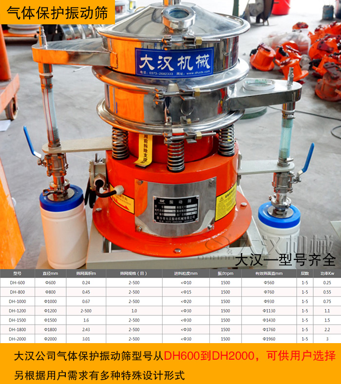 大漢公司氣體保護(hù)振動(dòng)篩型號(hào)從DH600到DH2000,可供用戶選擇。氣體保護(hù)旋振篩型號(hào)是從φ600-φ2000mm直徑,氣體保護(hù)旋振篩價(jià)格根據(jù)材質(zhì)和直徑大小、層數(shù)價(jià)格不同。除擁有DH系列的氣體保護(hù)振動(dòng)篩同等規(guī)格外,另有多種特殊設(shè)計(jì)形式,特殊物料的篩分,DH系列的氣體保護(hù)振動(dòng)篩有不同的特殊設(shè)計(jì),尤其是智能振動(dòng)超聲控制器的針對(duì)性設(shè)計(jì)、懶性氣體保護(hù)下篩分的設(shè)備結(jié)構(gòu)等。各種型號(hào)的設(shè)備都有現(xiàn)貨且可為用戶提供定制生產(chǎn),能夠大限度地滿足用戶的需求。
