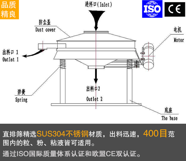 大漢公司以優(yōu)良的產(chǎn)品質(zhì)量,得到國內(nèi)外各界企業(yè)的鼎力支持與信任,并且建廠十余年中,擁有豐富的生產(chǎn)經(jīng)驗,憑借著對設(shè)備質(zhì)量的嚴格把關(guān),獲得了業(yè)內(nèi)外朋友的一致好評。產(chǎn)品均已通過ISO9001國際質(zhì)量體系認證歐盟CE雙認證,產(chǎn)品設(shè)備已遠銷至海外30多個國家(如德國,意大利等),用戶可以放心購買。大漢直排篩精選SUS304不銹鋼材質(zhì),物料在篩機中停留時間短,出料迅速,400目范圍內(nèi)的粒、粉、粘液皆可適用。