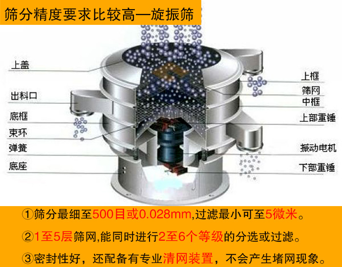 旋振篩作為一種高精度細粉篩分設備,篩分物料范圍廣,篩分細至500目或0.028mm,過濾小可至5微米。分級篩選,可篩1至5層篩網,能同時進行2至6個等級的分選或過濾,處理量大。密封性好,還配備有專業(yè)清網裝置,在篩分物料的過程中基本不會產生堵網現(xiàn)象,極大的提高了篩機的篩分產量和篩分效率。