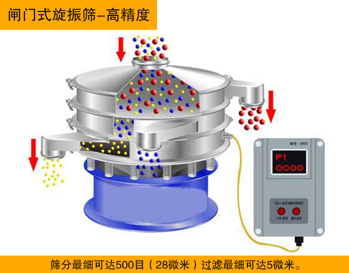 閘門式旋振篩是對特殊物料的處理有加閘門型設計,篩分細可達500目(28微米)過濾細可達5微米。通過篩分過濾對物料粒度進行控制、精選,更適合對產(chǎn)量沒有太高要求但對篩分精度有很高要求的物料篩分。