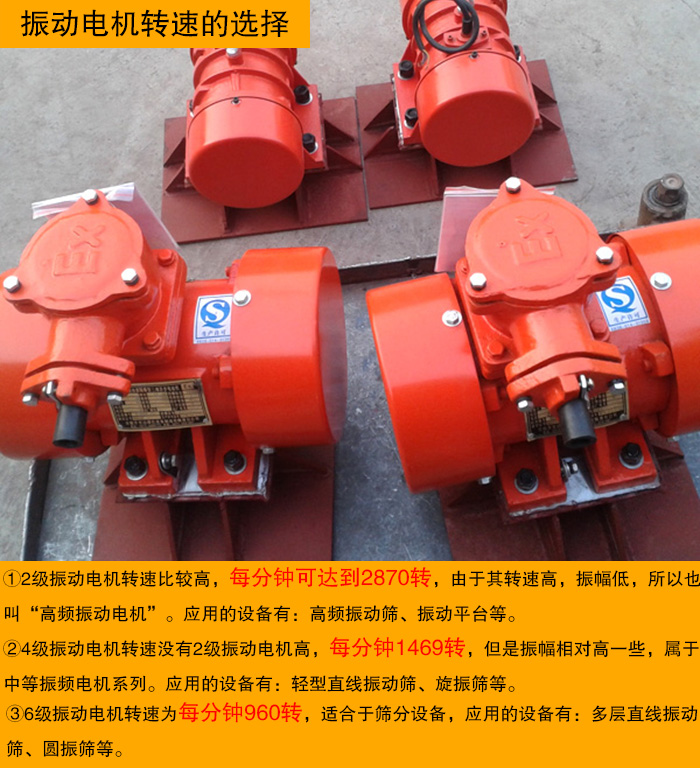 6級振動電機轉速為每分鐘960轉,適合于篩分設備,應用的設備有:多層直線振動篩、圓振篩等。