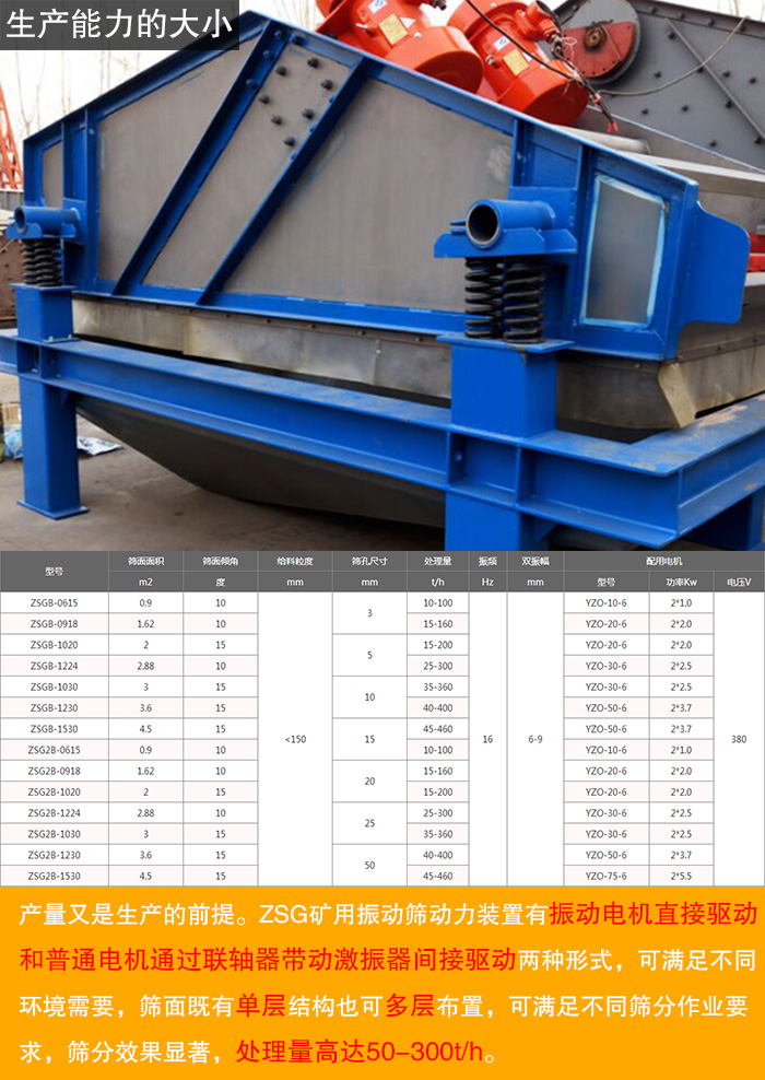 采購一臺(tái)設(shè)備都是用來服務(wù)生產(chǎn)的,產(chǎn)量又是生產(chǎn)的前提,所以機(jī)型的生產(chǎn)能力要略大于它的計(jì)劃能力。如果機(jī)型的生產(chǎn)能力低于計(jì)劃能力,就會(huì)使篩機(jī)超負(fù)荷運(yùn)轉(zhuǎn),從而減少了設(shè)備的使用壽命,還會(huì)造成浪費(fèi),增加采購成本。新鄉(xiāng)大漢ZSG礦用振動(dòng)篩動(dòng)力裝置有振動(dòng)電機(jī)直接驅(qū)動(dòng)和普通電機(jī)通過聯(lián)軸器帶動(dòng)激振器間接驅(qū)動(dòng)兩種形式,可滿足不同環(huán)境需要,篩面既有單層結(jié)構(gòu)也可多層布置,可滿足不同篩分作業(yè)要求,篩分效果顯著,處理量高達(dá)50-300t/h。