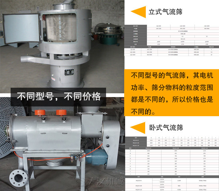 大漢氣流篩分為立式氣流篩和臥式氣流篩。 立式氣流篩型號有LQS-600型、LQS-1000型、LQS-1600型等,該機適合80-530目有網(wǎng)各種粉狀物料篩選分級,如:中藥粉、石墨粉、粉煤灰、活性炭等,篩分效率高、產(chǎn)量大、自動進料排料、連續(xù)作業(yè)。臥式氣旋篩型號有WQS18-65型、WQS30-100型、WQS50-130型特別適用篩選精細粉末、密度小(比重輕)、輕微濕度、易附粘性粉或有精電反應(yīng)的物料,不同型號的氣流篩,其電機功率、篩分物料的粒度范圍都是不同的,所以價格也是不同的。