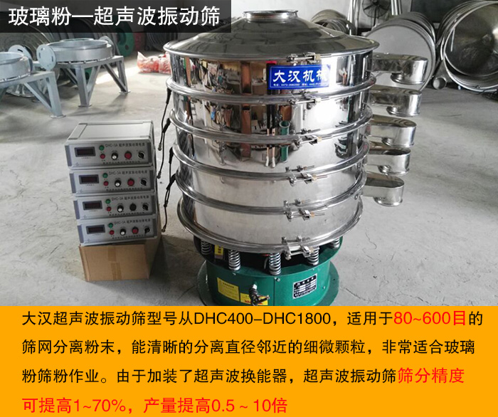 新鄉(xiāng)大漢超聲波振動篩型號從DHC400-DHC1800,適用于80~600目的篩網分離粉末,能清晰的分離直徑鄰近的細微顆粒,非常適合玻璃粉篩粉作業(yè)。由于加裝了超聲波換能器,超聲波振動篩篩分精度可提高1~70%,產量提高0.5~10倍,真正解決了強吸附性、易抱團、粘性強、高靜電、高密度、超細粉體等特性物料的篩分難題。超聲波振動篩價格主要由材質(碳鋼/不銹鋼)、型號等決定。