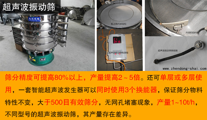 在解決粘性物料堵網(wǎng)問題的情況下,大漢超聲波振動篩而且精度可提高80%以上,產(chǎn)量達(dá)到1~10t/h,不同型號的超聲波振動篩,其產(chǎn)量存在差異。