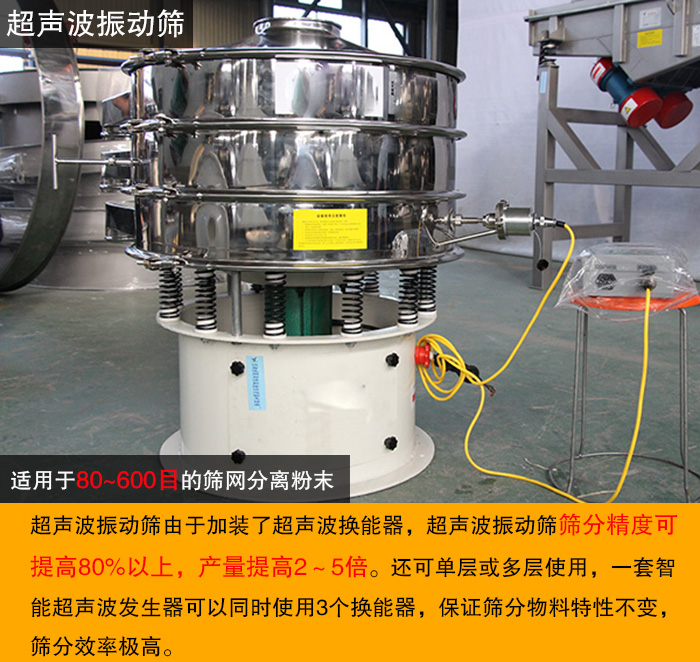 超聲波振動(dòng)篩由于加裝了超聲波換能器,超聲波振動(dòng)篩篩分精度可提高80%以上,產(chǎn)量提高2~5倍。還可單層或多層使用,一套智能超聲波發(fā)生器可以同時(shí)使用3個(gè)換能器,保證篩分物料特性不變,篩分效率極高。