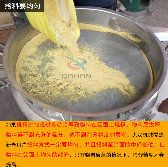 要想獲得較好的篩分效果,用戶還需在給料上多加注意,通常要求要均勻給料。如果投料過快或過多就會導致物料在篩面上堆積,物料層太厚,物料得不到充分的篩分,達不到篩分精度的要求,大漢機械提醒新老用戶投料方式一定要均勻,并且投料至篩面的中間部位,使物料在篩面上均勻的散開,只有物料層薄的情況下,篩分精度才會提高。