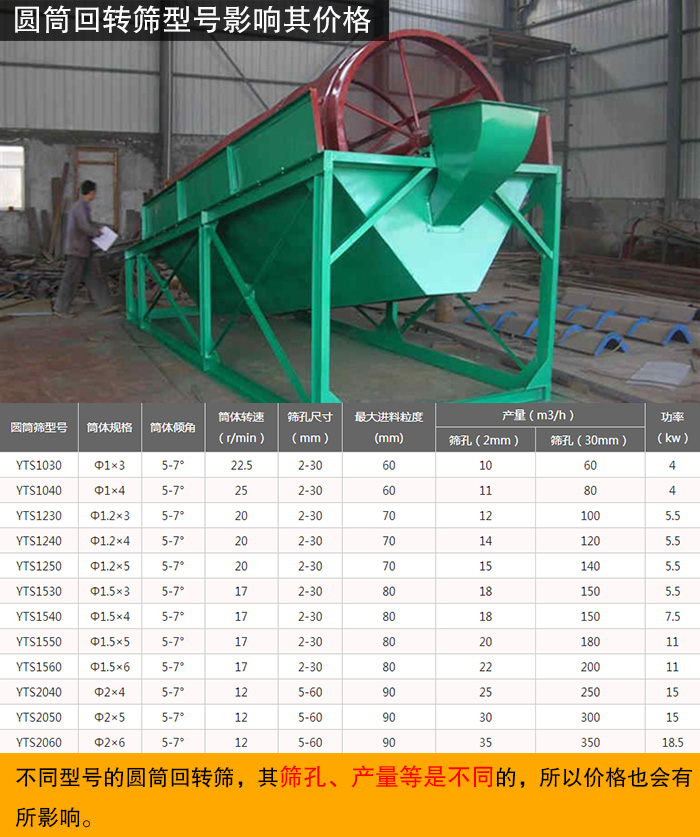 不同型號(hào)的圓筒回轉(zhuǎn)篩,其篩孔、產(chǎn)量是不同的,所以價(jià)格也會(huì)有所影響。圓筒回轉(zhuǎn)篩型號(hào)從YTS1030-YTS2060,其產(chǎn)量必然也是隨之增加的。圓筒回轉(zhuǎn)篩設(shè)備型號(hào)越大,產(chǎn)量就越高,其價(jià)格就會(huì)越高。(附參數(shù)表)