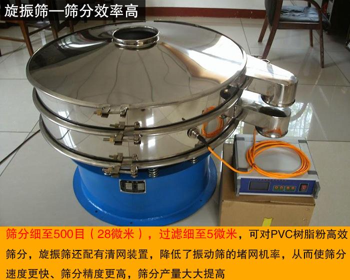旋振篩可以篩分過濾顆粒,細(xì)粉,漿液的物料,既可粗略分級(jí),又可精細(xì)篩分或者過濾,篩分效率高,根據(jù)實(shí)際生產(chǎn)需要可單層或多層使用,全封閉結(jié)構(gòu),無粉塵溢散,篩網(wǎng)不阻塞、粉末不飛揚(yáng)、篩分細(xì)至500目(28微米),過濾細(xì)至5微米,可對(duì)PVC樹脂粉高效篩分,旋振篩還配有清網(wǎng)裝置,降低了振動(dòng)篩的堵網(wǎng)機(jī)率,從而使篩分速度更快、篩分精度更高,篩分產(chǎn)量大大提高。