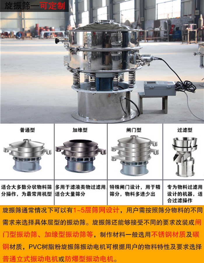 通常情況下,旋振篩通常情況下可以有1~5層篩網(wǎng)設(shè)計(jì),用戶需按照篩分物料的不同需求來選擇具體層型的振動(dòng)篩。旋振篩還能夠接受不同的要求改裝成閘門型振動(dòng)篩、加緣型振動(dòng)篩等,制作材料一般選用不銹鋼材質(zhì)及碳鋼材質(zhì),PVC樹脂粉旋振篩振動(dòng)電機(jī)可根據(jù)用戶的物料特性及要求選擇普通立式振動(dòng)電機(jī)或防爆型振動(dòng)電機(jī)。