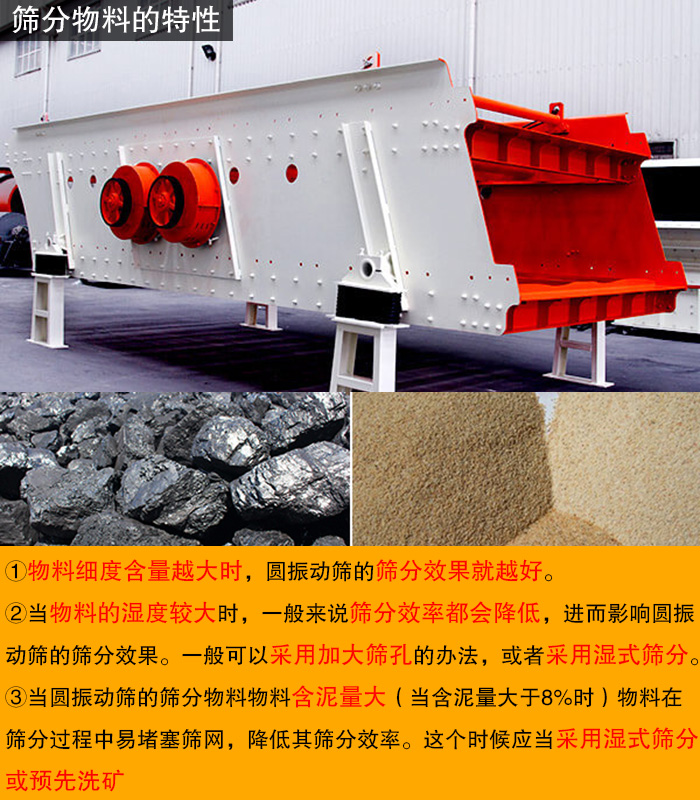 ①圓振動篩為礦用振動篩,所以篩分的物料大都是煤、礦等顆粒狀或大塊狀物料,但是只有物料細(xì)度含量越大時,圓振動篩的篩分效果就越好。