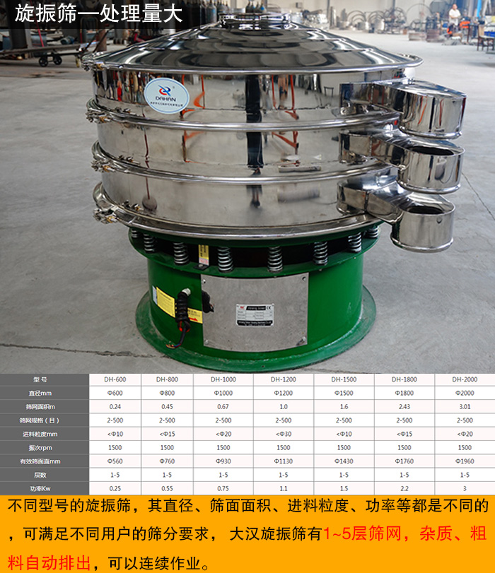 旋振篩型號(hào)從DH-600、DH-800、DH-1000、DH-1200、DH-1500、DH-1800、DH-2000,不同型號(hào)的旋振篩,其直徑、篩面面積、進(jìn)料粒度、功率等都是不同的,可滿足不同用戶的篩分要求, 大漢旋振篩有1~5層篩網(wǎng),雜質(zhì)、粗料自動(dòng)排出,可以連續(xù)作業(yè)。