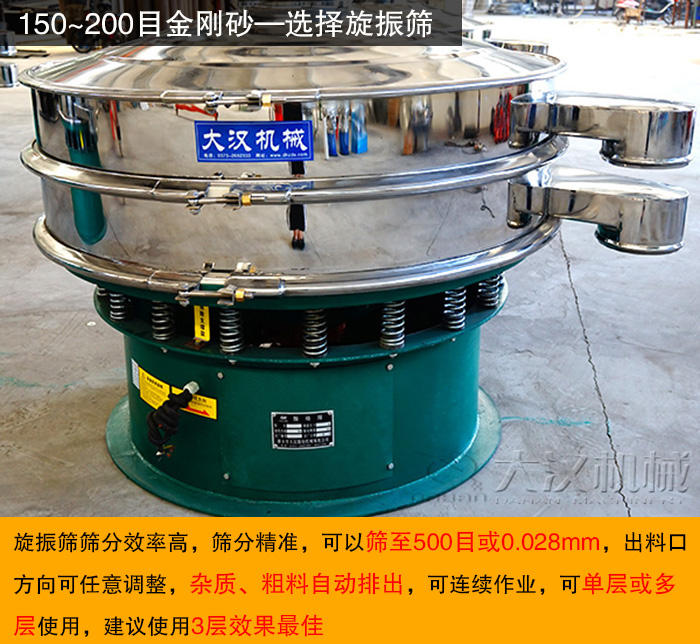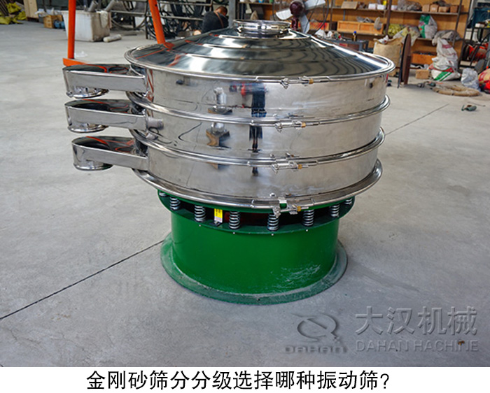 不同目數(shù)的金剛砂,選擇的振動篩是不同的,金剛砂粗目(8~10目),中目(150~200目),細目(300目以上)三大類,針對不同目數(shù)的振動篩,大漢廠家推薦以下3種類型的振動篩。