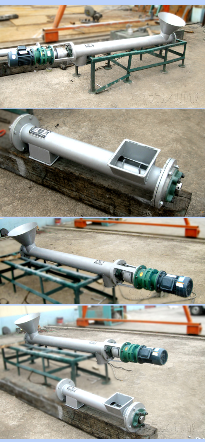 小型螺旋輸送機由驅動裝置、頭節(jié)、中間節(jié)、尾節(jié)、頭尾軸承、進出料裝置等幾部分組成,小型螺旋輸送機是利用旋轉的螺旋將被輸送的物料沿固定的機殼內推移而進行輸送工作,頭部及尾部軸承移至殼體外,吊軸承采用滑動軸承設有防塵密封裝置,軸瓦一般采用粉末冶金,輸送水泥采用毛氈軸瓦,吊軸和螺旋軸采用滑塊連接。